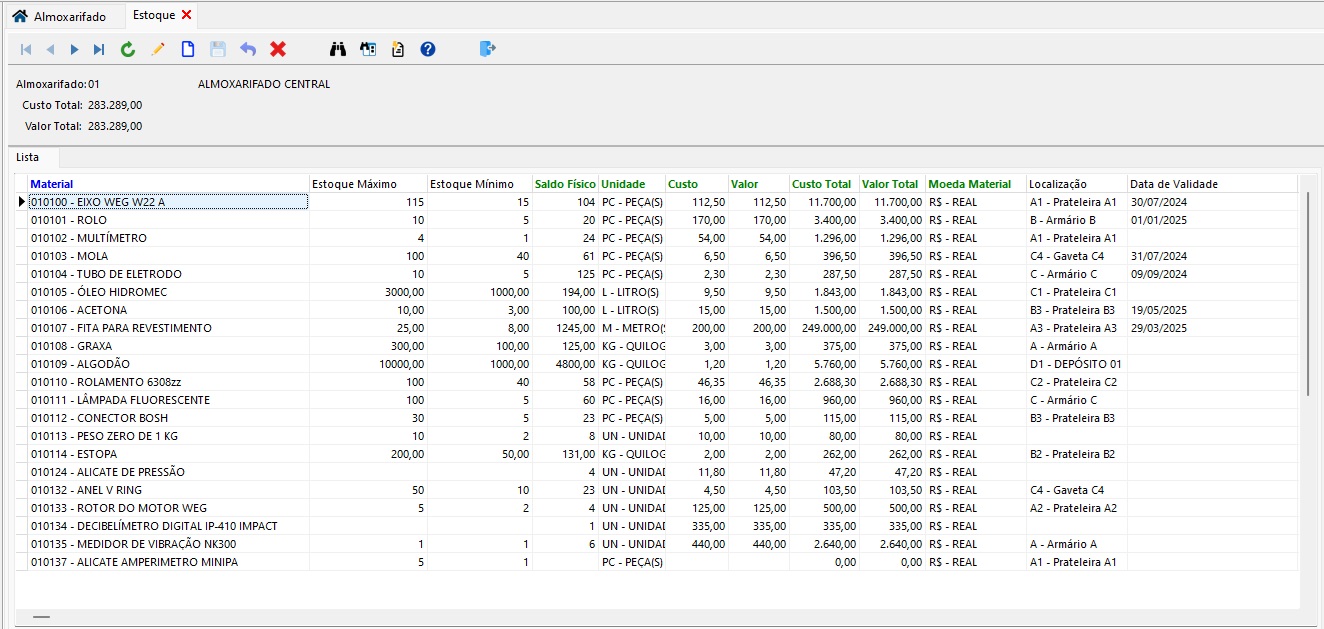 - Controle de almoxarifado: através do controle de estoque por seus respectivos almoxarifados é possível estipular estoque máximo e mínimo, associar a localização de cada material, fazer o controle por data de validade e lotes e muito mais. Veja a imagem abaixo: