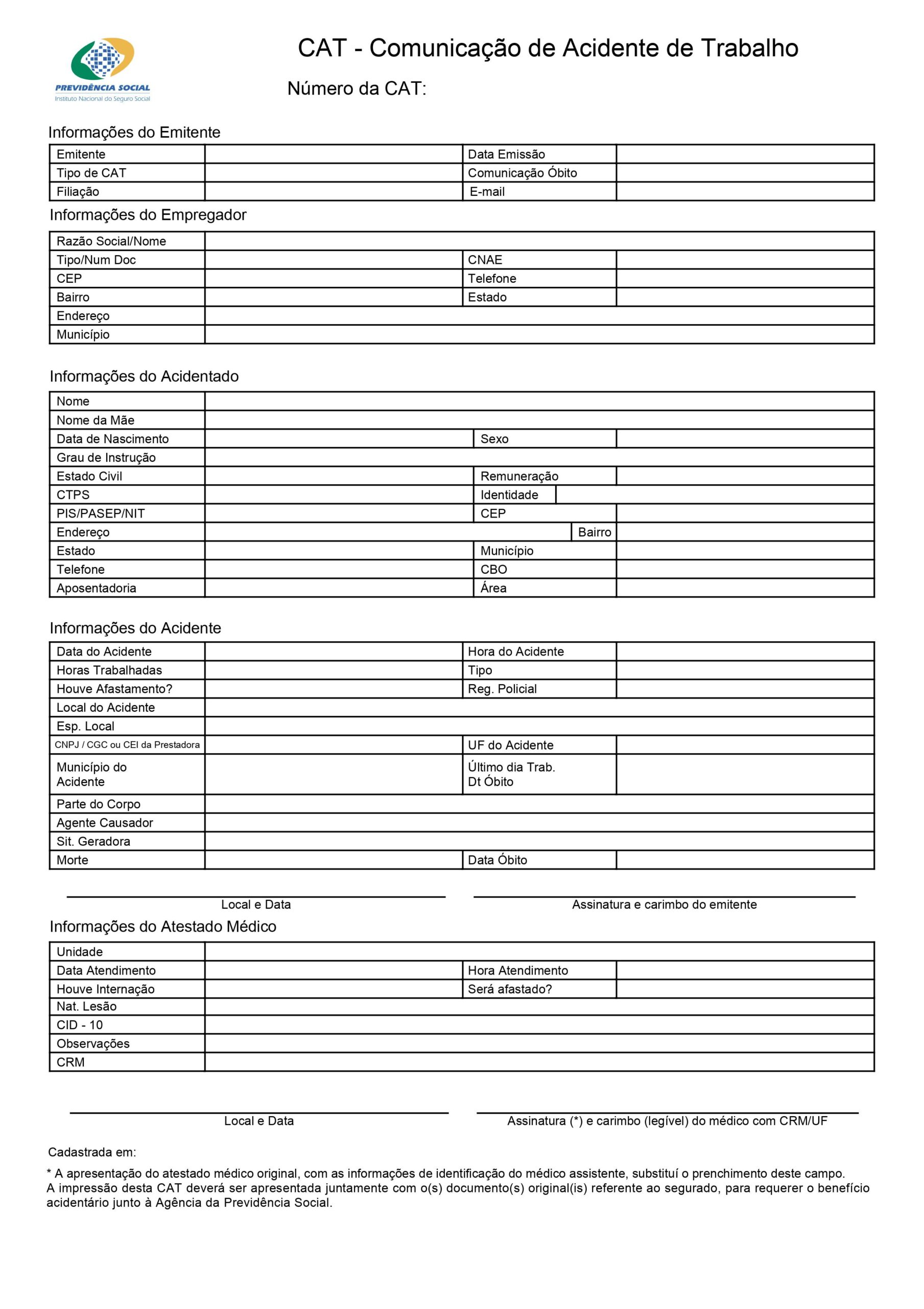 A seguir, veja o modelo do formulário da CAT, disponível no site do INSS: