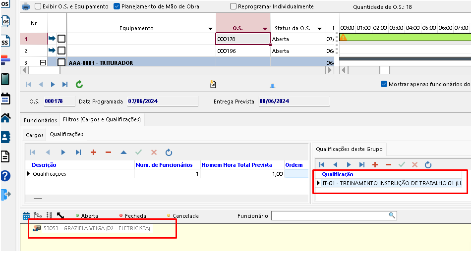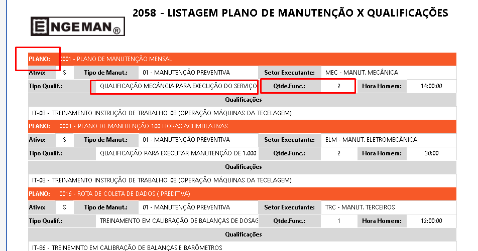 - Consultar relatório por plano de Manutenção x Qualificação e assim acompanhar quais qualificações são exigidas para esse plano e quantos funcionários são necessários para sua execução;
