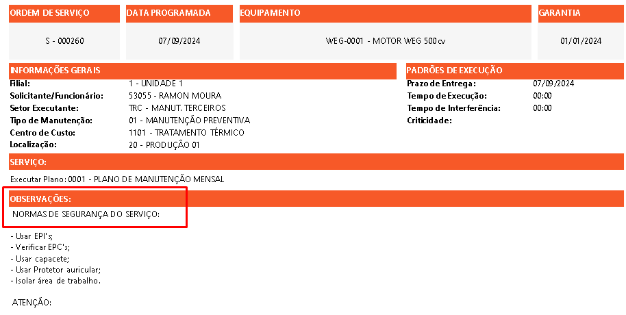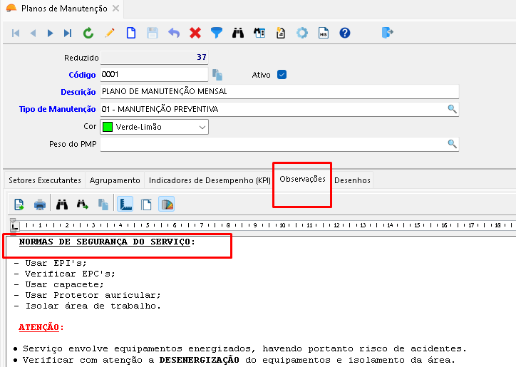Ainda dentro do cadastro de plano de manutenção, há o campo de “Observação” que é um campo de preenchimento livre e que permite relacionar informações de normas de segurança, por exemplo: