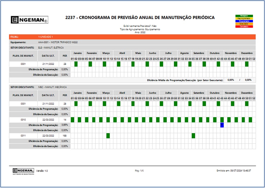 - Cronograma anual de 52 semanas: este cronograma irá te ajudar a cumprir as manutenções planejadas, pois ele mostra tanto o que foi planejado quanto programado, além disso você consegue acompanhar a eficiência dessas programações e execuções.