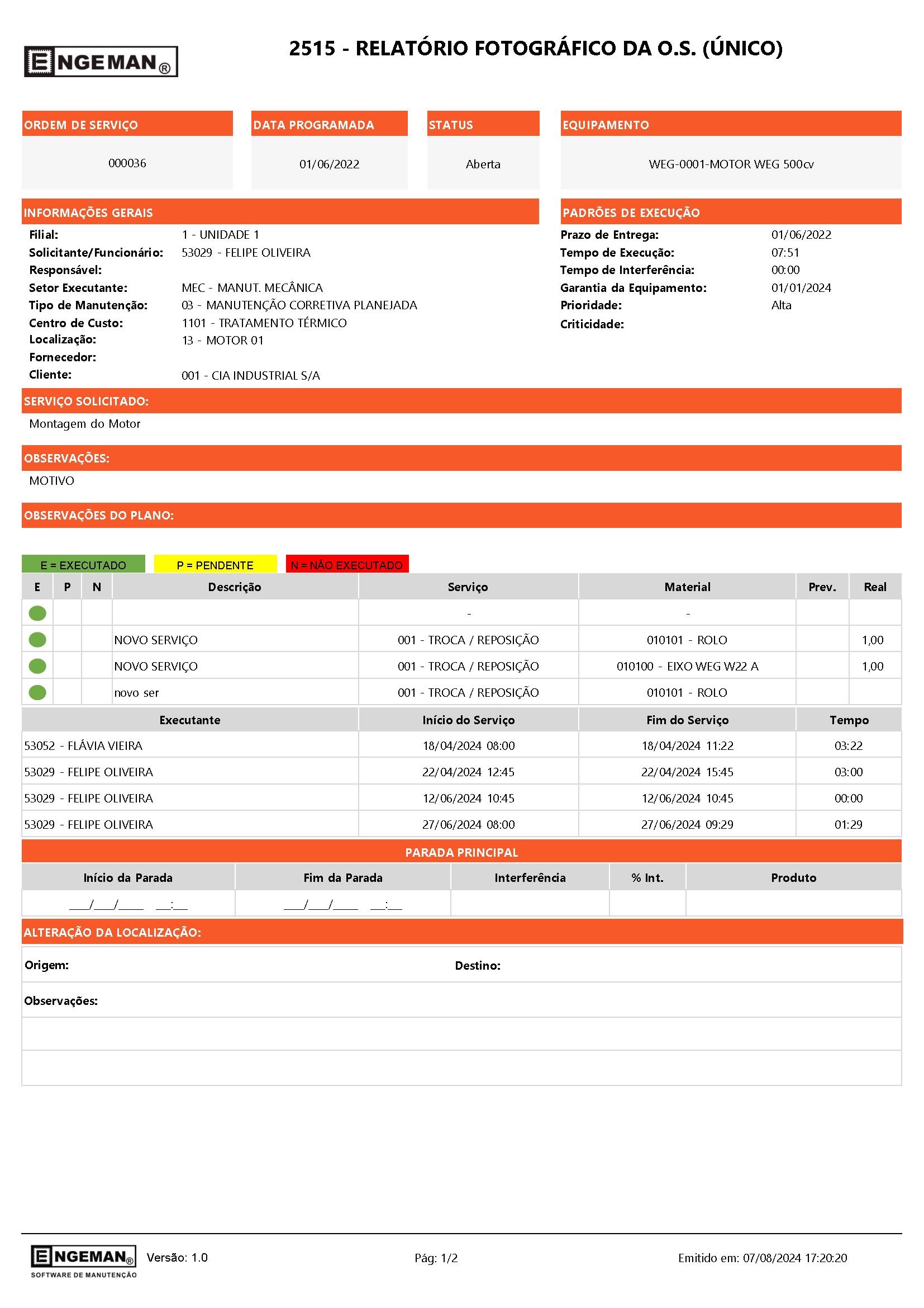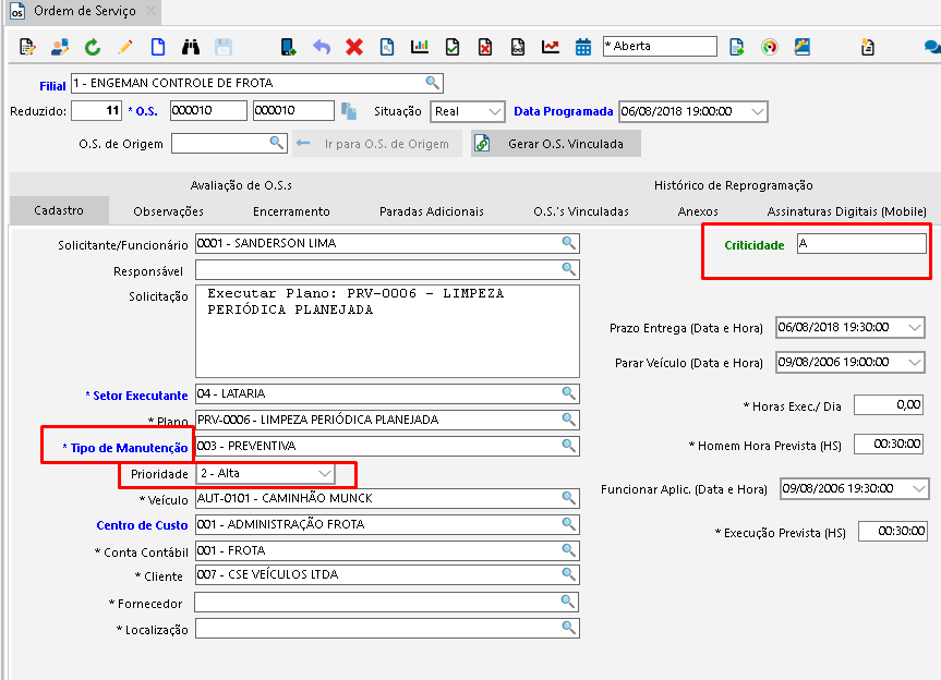 - Setor executante: qual o setor responsável em realizar o serviço. Pode ser o time de mecânica, setor civil, de elétrica ou ainda “terceiros”.