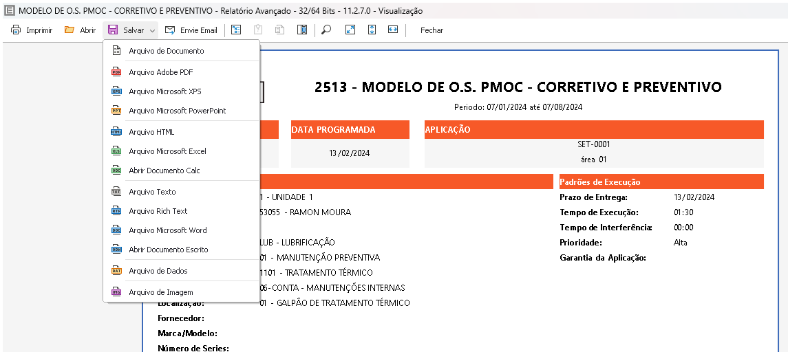 Tudo padronizado, atendendo aos requisitos que uma Ordem de Serviço precisa! Os modelos de relatórios podem ser exportados em diversos formatos e se adequarão ao formato escolhido para utilização: